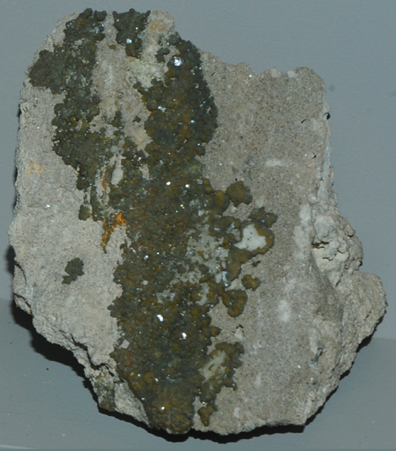 This sample of kleinite is displayed in the Smithsonian Museum of Natural History. Kleinite is a sulfate mineral of mercury, chlorine and nitrogen. It has the composition Hg2N(Cl,SO4).nH2O. The sample at left is about 10 cm across and is from McDermitt mine, Humboldt County, Nevada.