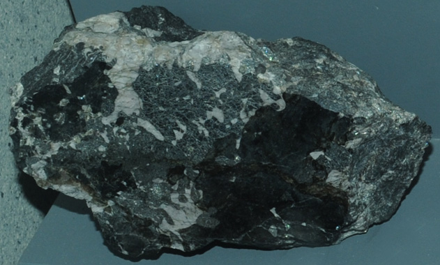 This sample of loellingite is displayed in the Smithsonian Museum of Natural History. Loellingite is an arsenide of iron with the composition FeAs2. The sample at left is about 20 cm across and is from Sterling Hill mine, Ogdensburg, New Jersey. It is described as loellingite with willemite and fayalite.