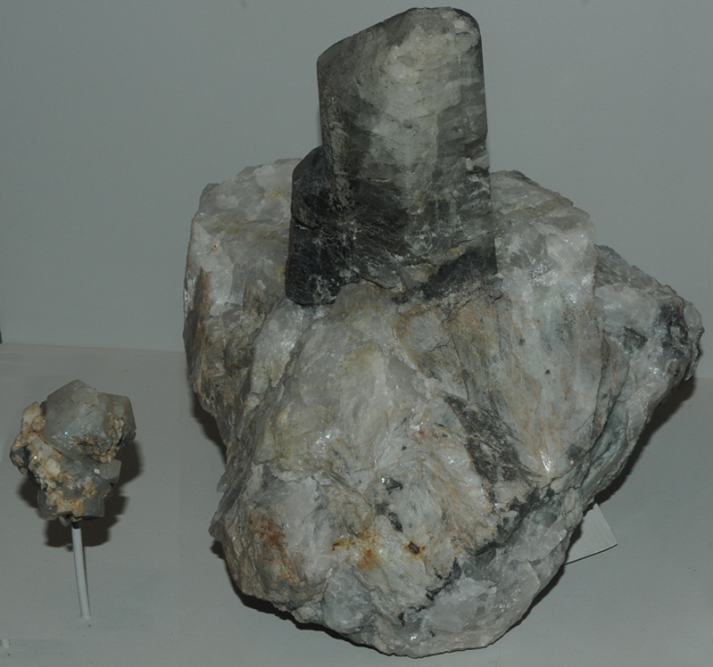 These samples of phenakite are displayed in the Smithsonian Museum of Natural History. Phenakite is a silicate mineral of beryllium with the composition Be2SiO4. The sample above right is about 18 cm across and is from Kragero, Telemark, Norway. The sample above left is 4-5 cm across and is from Mt. Antero, Chaffee County, Colorado. They are shown at the same scale.