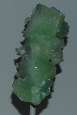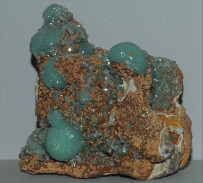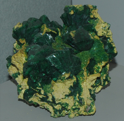 These samples of adamite are displayed in the Smithsonian Museum of Natural History. Adamite contains zinc and arsenic with the composition Zn2AsO4(OH). This sample is about 6x6 cm and is from Tsumeb, Namibia. It is classified as cuprian adamite because of the copper content.