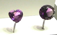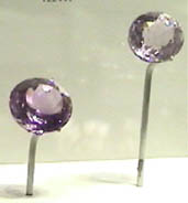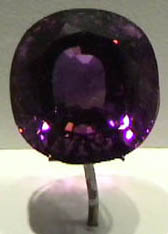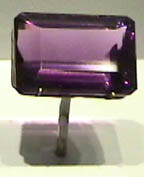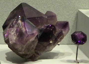 These samples of amethyst are displayed in the Smithsonian Museum of Natural History. Amethyst is a variety of quartz with the characteristic composition SiO2, but distinctive and popular for its dramatic purple color. The sample at left is from Upper Providence, Pennsylvania and is about 10x8 cm. The gem is 36.2 carats.