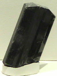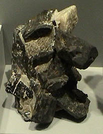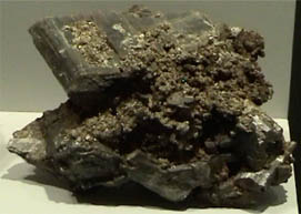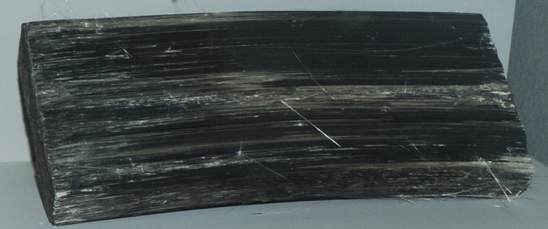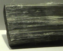 Grunerite is another fibrous mineral, one of those which were given the commercial name asbestos. The sample at left and below is a dense column of fibers about 20x8 cm and is from South Africa. It is labeled grunerite of variety amosite. Grunerite has the composition (Mg,Fe)7Si8O22(OH)2 .