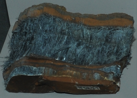 Riebeckite is a fibrous mineral, one of those which were given the commercial name asbestos. These samples are of the variety crocidolite.