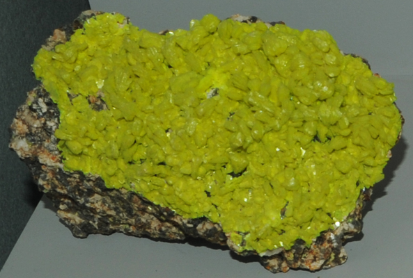 This sample of meta-autunite is displayed in the Smithsonian Museum of Natural History. Meta-autunite is a phosphate mineral of uranium with the composition Ca(UO2)2(PO4)2.6H2O. The sample at left is about 12 cm across and is from Central Massif, France.