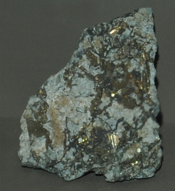 This sample of calaverite is displayed in the Smithsonian Museum of Natural History. Calaverite is a compound of gold and tellurium with the composition AuTe2. The sample at left is about 8 cm across and is from Doctor mine, Cripple Creek, Colorado.