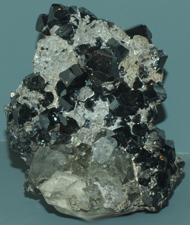 This is cassiterite with quartz from Horni Slavkov, Cechy, Czech Republic. It is about 12 cm wide.