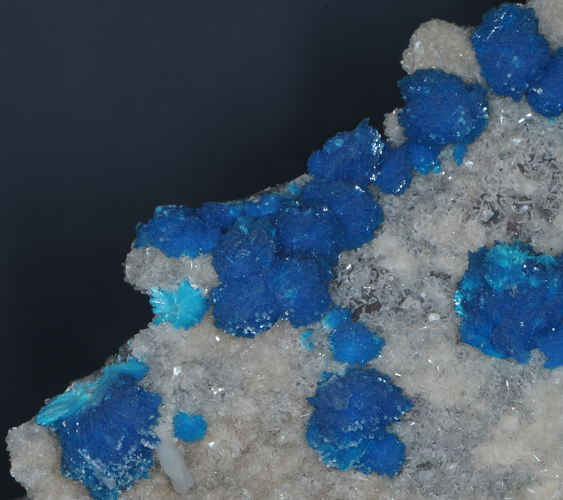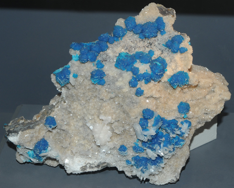 Until deep blue crystal clusters like these were discovered near Poona, India in the 1970s, the only cavansite specimens known were tiny, pale crystals from Oregon's lava flows. The Poona area of India remains the sole source for such impressive cavansite. The sample is on display at the Smithsonian Museum of Natural History.