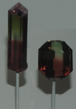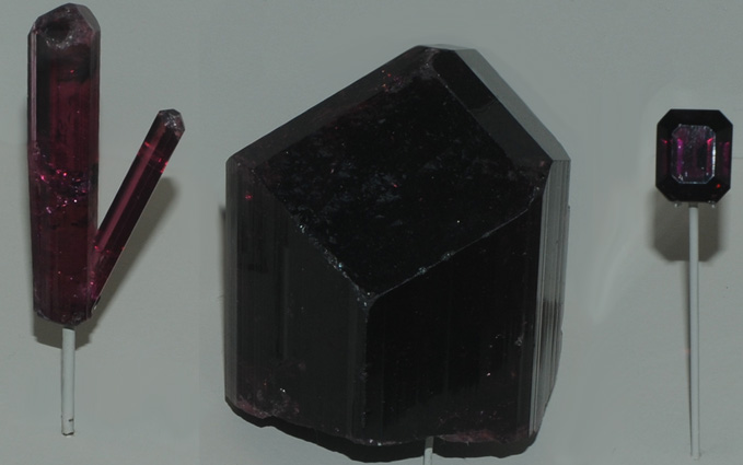 | The branched column at left is from Jonas mine, Itatiaia, Minas Gerais, Brazil. It is elbaite of the variety rubellite. The center speciment is a short column of about 10 cm diameter and at right is a 15.9 carat gem from Madagascar. They are all at the same scale.