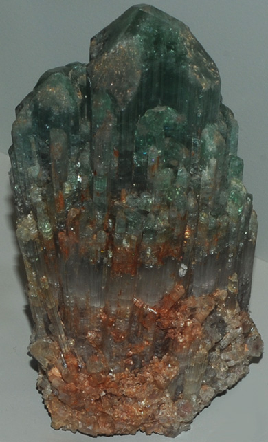 This elbaite sample is from Santa Rosa mine, Minas Gerais, Brazil and is about 8-10 cm at its base. It shows the kind of progession in color that can occur with crystal growth in elbaite.