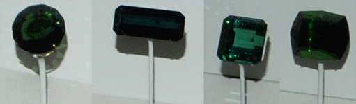 The elbaite gem above left is 40.3 carats and is from Tanzania. The next gem is of variety indicolite and is 25.5 carats. It is from Minas Gerais, Brazil. The two gems at right above are 46 and 71.1 carats and are from Nuristan, Afghanistan.