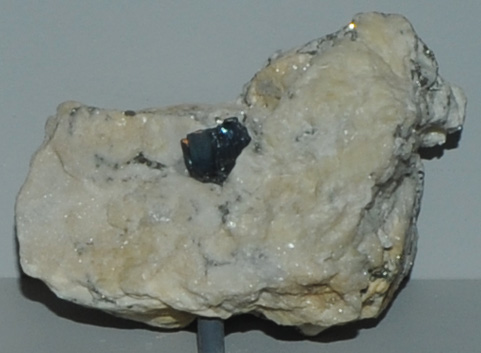 This sample of jordanite is displayed in the Smithsonian Museum of Natural History. Jordanite is an sulfide mineral of lead, arsenic and antimony with the composition Pb14(As, Sb)6S23. This sample is about 5x4 cm and is from Lengengach quarry, Imfeld, Binnatal, Valais, Switzerland.
