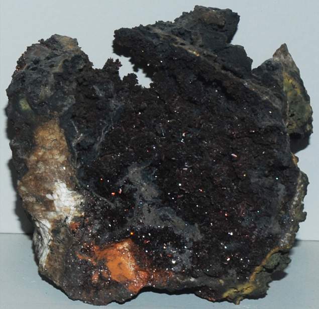 This sample of lepidocrocite is displayed in the Smithsonian Museum of Natural History. Lepidocrocite is an oxide of iron with the composition FeO(OH). This sample is about 12x12 cm and is from Horhausen, Rhineland-Pfalz, Germany.