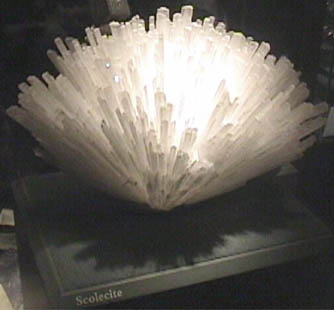 This large sample of scolecite is displayed in the Smithsonian Museum of Natural History. It is about 50 cm across.