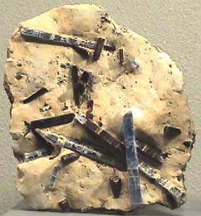 Staurolite is a silicate with composition (Fe,Mg)4Al17(Si,Al)8O44(OH)4 . This sample is about 8x9 cm and is from Monte Campione, Uri, Switzerland. The staurolite is the background material and the embedded slender crystals are kyanite . This sample is on display at the Smithsonian Museum of Natural History.