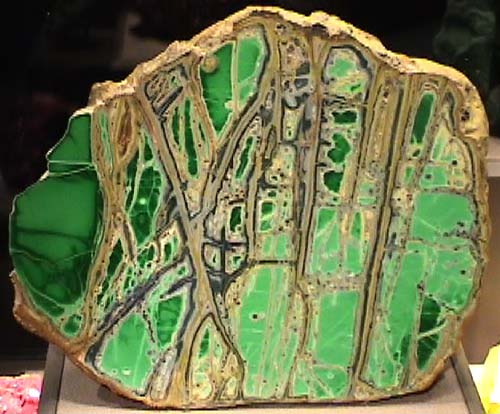Variscite is an phosphate mineral of aluminum with the composition AlPO4.2H2O . This sample is from the Fairfield, Utah. It is on display in the Smithsonian Museum of Natural History. The sample measures about 20x20 cm.