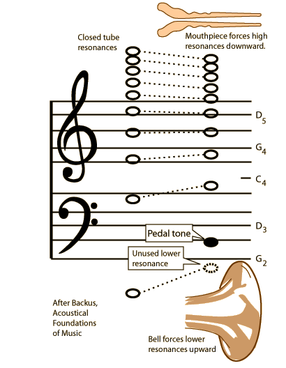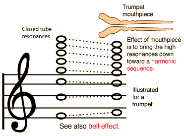 A closed tube produces only odd harmonics, but it is desirable for a brass instrument to produce all harmonics - a full harmonic sequence. This is accomplished by forcing the resonant frequencies toward the harmonic frequencies with the acoustic effects of the bell and mouthpiece. The mouthpiece forces the upper resonances down (the mouthpiece effect) and the bell forces the lower resonances up (the bell effect). The result is close to a harmonic sequence, but the lowest resonance is discarded and an extra pedal tone can be played as the fundamental of the sequence.