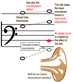 Besides being a very effective sound radiator, the bell of a brass instrument affects its acoustics by raising the lower resonances from those of a closed tube toward a more useful harmonic sequence. The lowest resonance is shifted up the most. When the overall length is adjusted, the high resonances can be left unchanged. Another result of the addition of the bell is the production of the pedal tone, a unique characteristic of brass instruments.