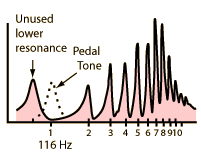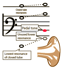 The pedal tone is a unique characteristic of brass instruments. It is the note which is at the fundamental frequency of the harmonic sequence of the instrument, but it is not a resonant frequency of the air column. When the bell effect raises the lower resonances of the closed tube, the lowest resonance is actually not used, being out of tune with the rest of the notes. However, if the player's lips are vibrated at the pedal tone frequency, all the harmonics above it contribute and produce a tone at this pedal tone pitch. It is sometimes called a fictitious fundamental, but for the bass brass instruments, it is quite strong and useful.