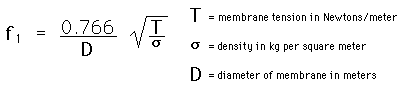 Circular MembraneThe vibrational modes of a circular membrane are very important musically because of drums, and in particular the timpani. The expression for the fundamental frequency of a circular membrane has some similarity to that for a stretched string, in that it depends on tension and density. The fundamental or 01 mode of an ideal circular membrane is given by: ![]() A timpani head, made of mylar of thickness about 0.2 mm might have the following values for those parameters: