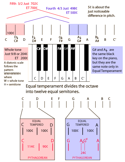 The equal tempered scale is the common musical scale used at present, used for the tuning of pianos and other instruments of relatively fixed scale. The middle octave of the piano is illustrated below and used to point to some of the features of equal tempered intervals compared to Just and Pythagorean intervals.