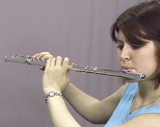 The flute is overblown to its second or third harmonic by a combination of increasing the airstream velocity and "rolling in" to decrease the gap between the players lips and the edge.