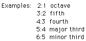 Musical IntervalsThe term musical interval refers to a step up or down in pitch which is specified by the ratio of the frequencies involved. For example, an octave is a music interval defined by the ratio 2:1 regardless of the starting frequency. From 100 Hz to 200 Hz is an octave, as is the interval from 2000 Hz to 4000 Hz. The intervals which are generally the most consonant to the human ear are intervals represented by small integer ratios. Intervals represented by exact integer ratios are said to be Just intervals, and the temperament which keeps all intervals at exact whole number ratios is Just temperament.
