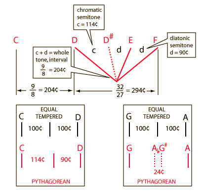 A pentatonic musical scale can be devised with the use of only the octave, fifth and fourth. It produces three intervals with ratio 9/8 and two larger intervals. If a 9/8 (whole tone) interval is carved out of the larger ones, a smaller (semitone) interval is left: B-C and E-F. This creates a Pythagorean diatonic scale. If the semitone thus created is taken from the whole tone, a chromatic semitone of different size is left over. This leads to some of the difficulties of Pythagorean temperament and other temperaments - such difficulties ultimately led to the development of equal temperament.