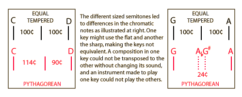 The natural wholle tone that arises in Pythagorean temperament leads to certain difficulties when compared to equal temperament as shown below.