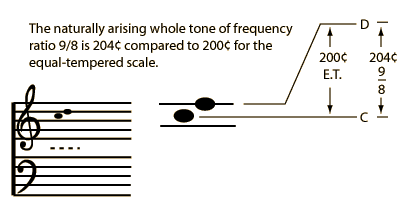 In the buildup of a pentatonic scale using the musical intervals which have been found to be universally consonant ( octave, fifth, and fourth), an interval of ratio 9/8 naturally emerges. This interval satisfies the basic condition for consonance and it occurs in the basic pentatonic scale. This suggests the carving of another such whole tone from the larger interval remaining, leaving the smaller 256/243 interval. This whole tone is used in the Just and Pythagorean temperaments. In devising the equal tempered scale it was important to maintain not only the octave, fifth, and fourth at close to their just values, but also to maintain the whole tone. Expressed in cents notation, the natural whole tone is 204¢, compared to 200¢ for the equal tempered whole tone, just within the accepted 5¢ just noticeable difference.