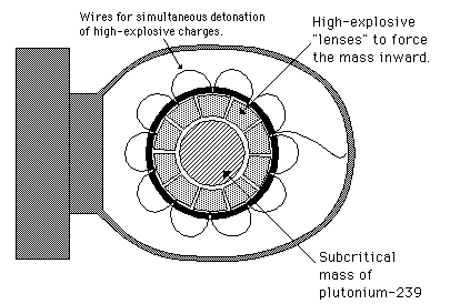 Implosion DetonationOne of the methods for quickly producing a super-critical mass of plutonium for a nuclear explosion is to fashion a sub-critical mass of Pu-239 in a spherical shape and then set off high explosives to drive it inward. A spherical shell of high-explosive material is made up of fitting pieces (called "lenses" to focus the explosion inward) which are wired with detonators to set them off simultaneously. This creates enough force to increase the density of the sphere of plutonium to the point where it is super-critical. This implosion technique was used in the first plutonium bomb test at Alamogordo and in the Nagasaki bomb, each with an explosive power of about 20 kilotons of TNT. The chain reaction lasts about a microsecond. |