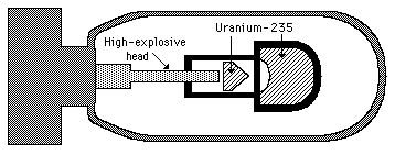 Gun-Type Nuclear DetonationsWhen one sub-critical mass of a fissile material is held in place and another sub-critical mass is fired into it with the use of high explosives such that the assembly is then super-critical, this is called a gun-type nuclear device. This kind of device was used to construct the Hiroshima bomb. The explosive must force the additional mass into contact so that it maintains contact for about a microsecond, the time it takes for the rapid chain reaction to produce the nuclear explosion. The explosive mass is held in place partly by a heavy, solid surrounding shell called a tamper. ![]() |