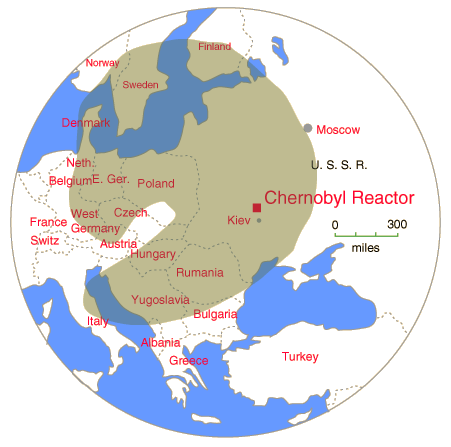 Chernobyl Radioactive Contamination Cloud![]() This is a depiction of the contamination cloud roughly following that reported by Time Magazine on May 12, 1986. Some of the first reports of radioactivity came from Finland since the U.S.S.R. was silent about the accident until after it had been detected by its neighbors to the north. With time, some detectable radiation spread throughout the world. |