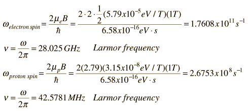 Nuclear Magnetic ResonanceWhen the nuclear magnetic moment associated with a nuclear spin is placed in an external magnetic field, the different spin states are given different magnetic potential energies. In the presence of the static magnetic field which produces a small amount of spin polarization, a radio frequency signal of the proper frequency can induce a transition between spin states. This "spin flip" places some of the spins in their higher energy state. If the radio frequency signal is then switched off, the relaxation of the spins back to the lower state produces a measurable amount of RF signal at the resonant frequency associated with the spin flip. This process is called Nuclear Magnetic Resonance (NMR). A magnetic dipole moment (usually just called "magnetic moment") in a magnetic field will have a potential energy related to its orientation with respect to that field. ![]() Note that the electron spin magnetic moment is opposite to the electron spin while the proton spin magnetic moment is in the direction of the proton spin. The electron spin or proton spin will tend to precess around the magnetic field with a frequency traditionally called the Larmor frequency. For a 1 Tesla magnetic field this Larmor frequency would be ![]() The Larmor frequency can be visualized classically in terms of the precession of the magnetic moment around the magnetic field, analogous to the precession of a spinning top around the gravity field. It can also be visualized quantum mechanically in terms of the quantum energy of transition between the two possible spin states for spin 1/2. This can be expressed as a photon energy according to the Planck relationship. The magnetic potential energy difference is hn = 2mB. The short table of Larmor frequencies below is from Hobbie, Ch 17 and Becker. An extensive list including the magnetic moments and Larmor frequencies of most elements can be found in Appendix A of Becker.
