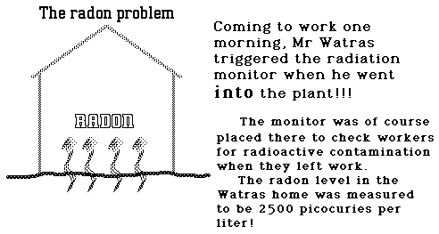 More about the Watras homeA new nuclear power plant was preparing to start up near Pottstown, Pennsylvania, and its management began requiring workers to pass through a radiation monitoring portal to check whether any radioactive contamination was being carried out as they left the plant. Curiously, one of the workers, Stanley Watras, set off the alarm on entering the plant. The problem was traced to radon in his home. In fact, to this day his house still holds the world record, 2,700 pCi/l! The Watras house is on the Reading Prong, a granite formation that extends from near Reading in southeastern Pennsylvania, through a wide band of northern New Jersey State (e.g., Morris County), a narrow band in New York State (e.g., Putnam County), and into Connecticut. This whole formation is known to have high uranium content and hence was expected to have radon problems. However, measurements now make it clear that the radon problems are largely confined to the Pennsylvania section plus extreme western New Jersey.