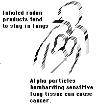Radon in the AirOne would think that radon was the least of our radiation problems since it is an inert gas. That would be so except that when we breathe, we are constantly passing air into our lungs and out of them. In this process, the radon gas simply goes in and out, doing little damage, but the radon daughters, being basically solid materials, and sometimes being electrically charged, can stick to the surfaces of our bronchial tubes. This puts them right where they can do the most harm, for the cells lining our bronchial tubes are among the cells of our body most sensitive to radiation-induced cancer. The alpha particles emitted in the decay of radon daughters, in spite of their poor penetrating power, can reach these very sensitive cells because they are deposited so close to them. To make matters very much worse, alpha particles are much more efficient than other types of radiation for inducing cancer. The very fact that they are not penetrating means that they dump a lot of their energy into each of the biological cells they pass through, and this large release of energy into a single cell is just what is needed to initiate a cancer. As a result an alpha particle is a hundred times more likely to cause cancer than other types of radiation, if it can reach the target cells. Our breathing processes allows the alpha particles from radon daughters to reach these cells. Radon is believed to be an important cause of lung cancer, killing about 10,000 Americans each year. Only cigarette smoking causes more lung cancer deaths per year. And in perhaps one out of a thousand American homes, radon levels are so high they pose a greater lung cancer risk than smoking a pack of cigarettes per day.