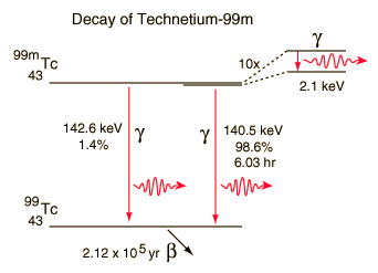 The technetium isotope 99mTc is unusual in that it has a half-life for gamma emission of 6.03 hours. This is extremely long for an electromagnetic decay - more typical is 10-16 seconds. With such a long half-life for the excited state leading to this decay, this state is called a metastable state, and that is the reason for the designation 99m. Some aspects of the complex decay of this radioisotope are shown in the diagram below. The dominant decay mode gives the useful gamma ray at 140.5 keV.