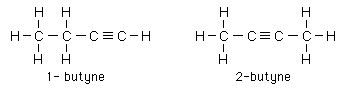 Aliphatic hydrocarbons with one triple bond between carbons are called alkynes. They follow the naming convention of the alkanes except that the suffix -yne is used instead of -ane. For alkynes above propyne the position of the double bond must be specified in the name.