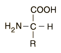 Amino acids are organic compounds which contain both an amino group and a carboxyl group. They are distinguished by the attached functional group R.