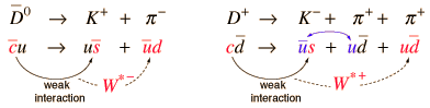 An interesting example of a particle interaction which involves the D meson was observed in a bubble chamber at SLAC in 1982 (K. Abe et al., Phys. Rev. Lett. 48,1526 (1982)). Photons at about 20 GeV were produced by Compton scattering of radiation from a YAG laser from energetic electrons from the linear accelerator. The interaction is sketched from the bubble chamber photograph. The presumption is that the photon interacted with a proton, producing the D mesons indicated. The reaction which produced these products would appear to be the following. ![]() The reaction can be analyzed by examining the quark content of the products, and is seen to involve the production of a charm-anticharm quark pair. From the bubble chamber tracks, it can be seen that the neutral D meson decays into two products and the positive D meson decays into three. While the specific products can not be identified with just this photograph, it is interesting to propose possibilities for this process. The decays shown below are one possibility. ![]() Since the D meson is the lightest meson which contains a charm quark, it must change that charm quark to some other quark in order to decay. Transmutations of quarks occurs by the weak interaction, which changes the charm quark to a strange quark with a W particle. This weak interaction process is indicated in both of the decays above. For the particular decay proposed for the positive D meson, an up-antiup quark pair is also required. There are many possible decay processes for the D meson because it has a lot of excess mass energy. These all involve the weak interaction to change the charm quark, and the variety of W decays provide many paths for the process. 2011 reports from the Beauty detector of the Large Hadron Collider suggest that D-mesons seem to decay slightly differently from their antiparticles. The LHCb team reported a difference of about 0.8 percent - a significant difference that, if true, could herald the first "new physics" to be found at the LHC.