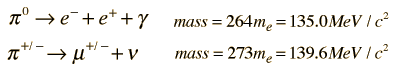 The neutral pion decays to an electron, positron, and gamma ray by the electromagnetic interaction on a time scale of about 10-16 seconds. The positive and negative pions have longer lifetimes of about 2.6 x 10-8 s.