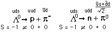 The Strange QuarkIn 1947 during a study of cosmic ray interactions, a product of a proton collision with a nucleus was found to live for much longer time than expected: 10-10 seconds instead of the expected 10-23 seconds! This particle was named the lambda particle (Λ0) and the property which caused it to live so long was dubbed "strangeness" and that name stuck to be the name of one of the quarks from which the lambda particle is constructed. The lambda is a baryon which is made up of three quarks: an up, a down and a strange quark. The shorter lifetime of 10-23 seconds was expected because the lambda as a baryon participates in the strong interaction, and that usually leads to such very short lifetimes. The long observed lifetime helped develop a new conservation law for such decays called the "conservation of strangeness". The presence of a strange quark in a particle is denoted by a quantum number S=-1. Particle decay by the strong or electromagnetic interactions preserve the strangeness quantum number. The decay process for the lambda particle must violate that rule, since there is no lighter particle which contains a strange quark - so the strange quark must be transformed to another quark in the process. That can only occur by the weak interaction, and that leads to a much longer lifetime. The decay processes show that strangeness is not conserved: ![]() The quark transformations necessary to accomplish these decay processes can be visualized with the help of Feynmann diagrams.