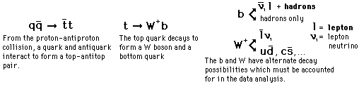 The Top QuarkConvincing evidence for the observation of the top quark was reported by Fermilab 's Tevatron facility in April 1995. The evidence was found in the collision products of 0.9 TeV protons with equally energetic antiprotons in the proton-antiproton collider. The evidence involved analysis of trillions of 1.8 TeV proton-antiproton collisions. The Collider Detector Facility group had found 56 top candidates over a predicted background of 23 and the D0 group found 17 events over a predicted background of 3.8. The value for the top quark mass from the combined data of the two groups after the completion of the run was 174.3 +/- 5.1 GeV. This is over 180 times the mass of a proton and about twice the mass of the next heaviest fundamental particle, the Z0 vector boson at about 93 GeV. The interaction is envisioned as follows: ![]()