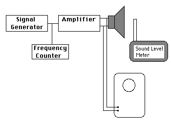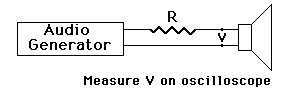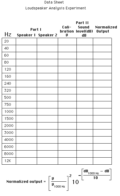 ![]() Figure 1. Impedance Method about 200 ohms with an 8 ohm speaker keeps the load seen by the audio generator about constant. The output of the audio geneator should be kept constant as different frequencies are sampled. Then the voltage V will be proportional to the effective impedance of the speaker, including the back emf from the motion of the voice coil. The peak-to-peak voltage as measured on the occilloscope may be used. This voltage should show a peak at the resonant frequency and show any irregularities in impedance from the crossover network, etc. First do a plot of the response of the 'el cheapo' unenclosed loudspeaker provided, and then one of the small, enclosed loudspeakers. A data sheet has been provided to give you a set of frequencies to sample. In addition, search for the resonance and take several readings near resonance to get a good plot of the resonance peak. Look for any irregularities in response so that they can be shown on your plot. Plot the speaker response on semilog paper with frequency on the log axis and the vertical scale adjusted so that the resonant peak goes near the top of the paper. (The increase of voltage for high frequencies near 10,000 Hz is due to increasing inductive reactance of the voice coil and not an indication of enhanced speaker response at these frequencies.) Determine and record the "free cone resonant frequency" of each speaker if possible (if a speaker is good enough, its free cone resonance may be smoothed enough to obscure it.) II. Direct Sound Output Method A sine wave generator will be passed through an audio amplifier which will drive the small enclosed speaker. The sound output will be measured with the sound level meter on the flat (20kHz) frequency response setting. The speaker output as a function of frequency can then be plotted. Caution: A sine wave signal to a loudspeaker can burn out the voice coil of the speaker. Do not produce extremely loud sounds or hold the frequency constant for a long time in this experimental arrangement. A reasonable procedure would be to produce a sound at some midrange frequency like 500 Hz and adjust that sound to something like 20 dB above the background level in the room. Monitor the output of the amplifier on an oscilloscope and decide on a standard peak-to-peak voltage to use as a reference. Then use that same output voltage for all other frequencies used for measurement. Scan through the frequency range, making measurements of speaker output at each of the frequencies indicated on the data sheet after adjusting the output voltage to your standard level on the scope. Measure the frequency with the use of a digital frequency counter before it goes into the power amplifier. It is important to fix the positions of the speaker and the sound level meter for this experiment. The data reflect not only the speaker but also room effects, so at least the room effects should be kept as constant as possible. Normalize the speaker data to the calibration data using the expression at the bottom of the data sheet. Note that the values at 1000 Hz are used as a standard - this is an arbitrary choice of reference frequency, but relative values are all that are needed for the plot. If you use the same voltage at every frequency as suggested above, the voltage correction term will always be 1.