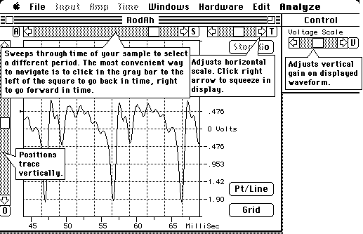 To collect data, play the tape and listen for the desired sound. When it starts, click the Stop/Go button on the screen with the mouse. It will display "GOING" below the button and collect data until the data buffer is full. When it is finished, it will display "STOPPED". After examining the display to make sure than you have captured a sample, save the data file on an external floppy disc with a name which indicates the person and the sound, like JimFlute or JohnAh.