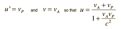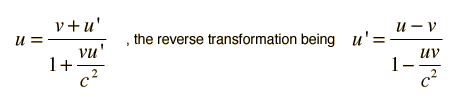 Einstein Velocity AdditionThe Einstein velocity relationship transforms a measured velocity as seen in one inertial frame of reference (u) to the velocity as measured in a frame moving at velocity v with respect to it (u'). In problems involving more than two objects, the main difficulty is the assignment of velocity to all the objects. ![]() If A sees B moving at velocity v, then a velocity measured by B (u') would be seen by A as: ![]() These relationships make perfect sense at low speeds where both denominators approach 1. |