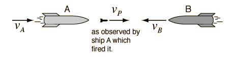 Relativistic ProjectileNow if spacecraft A fires a projectile at velocity Vp as measured in A's frame of reference, then the two relevant questions are: 1. How fast will an external observer see the projectile traveling? 2. How fast will B see the projectile approaching? This is an example of Einstein velocity addition. ![]() Taking question #1 first, then in the standard form: ![]() For low speeds, this expression yields a value equal to the sum of the magnitudes of the three velocities as indicated in the diagram. The Einstein velocity addition gaurantees that the resultant velocity does not exceed c, even if all three of the indicated velocities approach c! |
