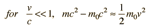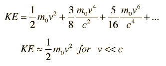 Kinetic Energy for v/c<<1The relativistic kinetic energy expression can be written as and the square root expression then expanded by use of the binomial theorem : ![]() giving Substituting gives: ![]() |
