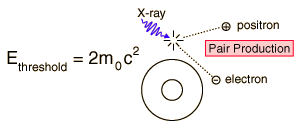 Pair ProductionEvery known particle has an antiparticle; if they encounter one another, they will annihilate with the production of two gamma-rays. The quantum energies of the gamma rays is equal to the sum of the mass energies of the two particles (including their kinetic energies). It is also possible for a photon to give up its quantum energy to the formation of a particle-antiparticle pair in its interaction with matter. The rest mass energy of an electron is 0.511 MeV, so the threshold for electron-positron pair production is 1.02 MeV. For x-ray and gamma-ray energies well above 1 MeV, this pair production becomes one of the most important kinds of interactions with matter. At even higher energies, many types of particle-antiparticle pairs are produced. ![]() |