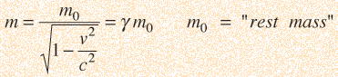 Relativistic MassThe increase in effective mass with speed is given by the expression![]() It follows from the Lorentz transformation when collisions are described from a fixed and moving reference frame, where it arises as a result of conservation of momentum. The increase in relativistic effective mass makes the speed of light c the speed limit of the universe. This increased effective mass is evident in cyclotrons and other accelerators where the speed approaches c. Exploring the calculation above will show that you have to reach 14% of the speed of light, or about 42 million m/s before you change the mass by 1%.