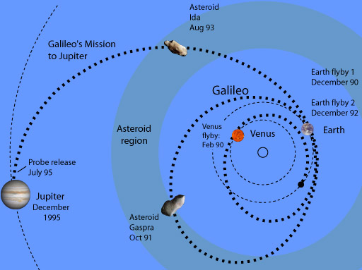 Galileo MissionLaunched on October 19, 1989, the Galileo spacecraft was designed for a study of Jupiter. After six years and about 2.5 billion miles, it reached Jupiter on December 7, 1995. The distance between to orbits of Earth and Jupiter is about 390 million miles. A 23 month survey of the Jupiter system was scheduled. The total cost of the mission is about $1.6 billion. Originally scheduled to be launched from the space shuttle in 1985, it would have been at Jupiter in 1987. Launch delays, the 1986 Challenger disaster, and the movement of the planets put it on a much slower and more circuitous path to Jupiter. Galileo has been boosted in its journey by gravity-assist maneuvers around Venus in 1990, around the Earth in 1990 and 1992, and around the asteroid Gaspra in 1991. It also had a close flyby of the asteroid Ida, at which it discovered a tiny moon of Ida, about 1 mile in diameter. In 1994, Galileo was the only instrument in position to view the actual impacts of Comet Shoemaker-Levy 9 with the surface of Jupiter. The journey of Galileo was plagued with difficulties like the failure of the main antenna to deploy. This forced the rewrite of the spacecraft's onboard software to make use of the backup antenna. An onboard recorder stored information for slower transmission to the Earth from the smaller antenna. The Jupiter probe was separated from the spacecraft in July, 1995 in preparation for the encounter with Jupiter in December. Galileo entered orbit around Jupiter on December 7, 1995.